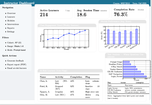 The instructor dashboard visualizes learner engagement and performance patterns generated through interactions with the GenAI Tutor. It summarizes key metrics such as active learners, session time, completion rate, and concept mastery. The dashboard integrates time-series activity trends, module-level progress charts, and detailed logs of learner actions. These analytics enable instructors to quickly identify learning bottlenecks, monitor class-wide progress, and adjust instruction accordingly.